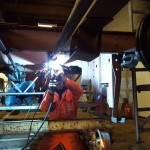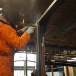 Een nieuwe mijlpaal is bereikt in het USATC / CHAW restauratieproject met het in elkaar zetten van één van de roldeuren. Een spannende zaak want nu moest blijken of de constructie van de bovenbouw recht is maar vooral ook haaks. Ook de recente reconstructie van de daklijst en daarbij behorende maatvoering is dusdanig krap dat het om millimeters gaat v.w.b. het passeren van de roldeur. Alles is gebaseerd op langs elkaar schuifende metalen strips zonder enige nette geleiding. En passen de door smeder Siem gevormde hoekstukken aan de onderzijde van de roldeuren in combinatie met de wielen en houder die eerder door de draaier gemaakt zijn ? Het samenstellen van de roldeur met allerlei ongelijkzijdige gezette delen en in elkaar vallende hoeken is daarmee nog een forse uitdaging. Met de originele fabriekstekening in de hand en het eerst met grote lijmtangen in elkaar zetten van de delen lukt het om tot een samenbouw te komen. Dan met een kleine lassen hechten en dan weer eens meten. De maatvoering direct overnemen van de tekening is ’tricky’ omdat tekening en werkelijkheid wel eens iets kunnen verschillen. En ja soms kom je een paar millimeter te kort zo merkten wij tijdens deze samenbouw. Maar een goede lasser weet daar wel raad mee. Smokkelen mag….en onder het mom van “het is oorlogsbouw, dus je moet niet te krap kijken” komt het dan helemaal goed. De ruwbouw kostte ons bijna een hele werkdag maar alles paste uiteindelijk toch en dan is het resultaat een prima rollende deur ! Hulde aan onze toeleveranciers dus ook. Met enige trots demonstreert onze lasser in een aparte video het resultaat. Klik HIER om het filmpje te bekijken. Maar laten wij niks af doen aan de andere werkers die het frame geheel ontvet en geruwd hebben zodat er begonnen kan worden aan het conserveren van dat frame. Ook een lastig werkje door de vele hoeken die in het frame aanwezig zijn. Langzaam maar zeker vorderen deze werkzaamheden nu ook zodat straks de houten vloer erop kan. Omdat de kou ons met het conserveren parten dreigt te spelen is besloten om een relatie, de firma Meerleveld, te vragen om bovenbouwdelen naar onze andere verwarmde werkplaats over te brengen zodat daar nog een hele werkdag verder kon worden gewerkt aan o.a. het boren van klinknagelgaten in de tweede daklijst en enkele hoekstijlen. Opvolgend werd alles met een eerste laag zinkprimer behandeld. Al met al twee zeer vruchtbare werkdagen !