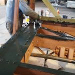 Het lijkt zo eenvoudig een gesloten goederenwagon bestaand uit een frame, een paar stijlen en wat platen hout. Maar voor ons vormt deze wagen toch nog een beste uitdaging. Met name veroorzaakt door het feit dat de diverse onderdelen van verschillende wagens afkomstig zijn, hersteld zijn, een beetje krom blijken te zijn, een gat soms net niet in lijn zit met de andere gaten. Want deze oorlogsgoederenwagen is in feite gelijk aan een Meccano doos. En dan hoop je maar dat alles na meer dan 70 jaar past maar dat is met deze grote onderdelen een beetje “wishfull thinking”. En er is een nieuwe langsbalk in het frame geplaatst zonder enig gat. Dit laatste is eigenlijk zelfs een voordeel want dan kan je gaten “passend” maken. Op deze werkdag zijn wij v.w.b. de bovenbouw (stijlen) vooral bezig geweest met het passen, meten, kijken, nog eens meten, logisch nadenken, referentiepunten bepalen enz, enz…. Een flinke uitdaging dus. Maar dankzij voor- en tekenwerk van één van onze medewerkers gaan we er uit komen. Daarnaast is er het nodige laswerk verricht aan de vacuumleiding en zijn er oude gaten in de frame langsbalken dichtgemaakt. Dankzij het draaiwerk van de stichting SZB uit Zeeland konden de 2 verstevigingsplaten op de koppen van het frame definitief vastgezet worden. Zij hebben boutkoppen afgedraaid zodat ze op klinknagels gaan lijken. Aan de achterzijde zit dan wel een moer maar die komt straks niet in het zicht omdat er een houten vloer bovenop komt. Daarnaast is de treksterkte 2x zo hoog van deze 10.9 bouten dan van een normale klinknagel. Met het monteren van deze verstevigingsplaten is het basisframe van de USATC wagen gereed gekomen, een mooie mijlpaal !