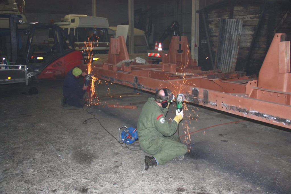 Na een lange tijd was er eindelijk weer gelegenheid om aan het USATC project in het Educatieve WO II Centrum te Medemblik te werken. Vandaag is het frame op werkhoogte gebracht en zijn oude lasrupsen afgeslepen en kleine restanten van later aangebrachte modificaties ongedaan gemaakt. De zoektocht naar een juiste Amerikaanse C9 x 15 framebalk heeft helaas niets opgeleverd. Daarom is er nu besloten toch een Europese standaard UNP balk in te brengen. Optisch gezien maakt dat geen verschil met een Amerikaanse balk. De korte flenzen zijn alleen iets langer dan de Amerikaan en de hoogte verschilt 1 cm. Dit zal worden opgevangen door onder de vloerdelen een vullat te plaatsen.